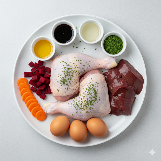 Ingredients: Chicken meat bone in, Beef Liver, Eggs, Carrots, Molasses, Apple Cider Vinegar, Parsley Flakes, Sunflower Oil, Beet Pulp, MSM & Glucosamine for joint health